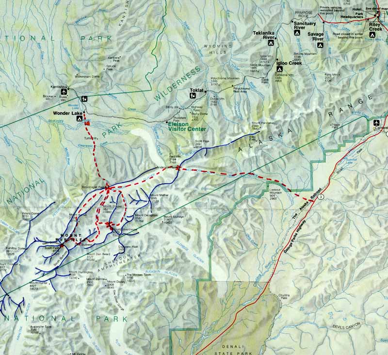 Внизу видны полоса реки Мак-Кинли и озеро Wonder Lake.