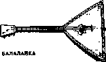 Балалайка -- струнный щипковый инструмент, родственница гитары, лютни, мандолины. У нее деревянный треугольный или полусферический корпус и длинный гриф, на которых натянуто три струны. На шейке грифа навязаны жилы на таком расстоянии друг от друга, что, нажимая между ними струны, можно извлечь звуки гаммы. Жилы эти называются ладами. Извлекается звук щипками или так называемыми бряцаниями -- ударом указательного пальца по всем струнам сразу.