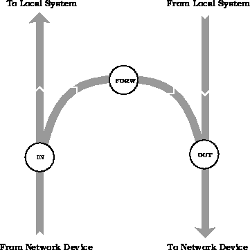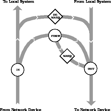 Masquerading takes place after passing the forward firewall filter. Demasquerading is done after receiving a packet and demasqueraded packets bypass the forwarding filter. Figure 2 shows the kernel flow diagram including (de)masquerading.