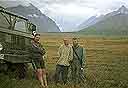 На плато перед пер. Орой. Справа налево: В.Юрин, И.Валяева, К. Наумов и его вездеходный экипаж.