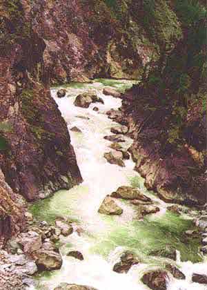 который еще иногда называют турбиной. Река шириной метров 40 сваливается в щель шириной 3 - 4 метра. Эта щель непрямая, а изогнутая наподобие лопасти винта. Вода падает с высоты метров 3 и на всем протяжении с силой бьет в скалу. Следующее препятствие - через метров 50 несколько разбросанных в русле обливных камней и затем струя бьет левобережную скалу, в которой промыт большой подводный карман. Эти оба препятствия - непроходимы. Далее в каньоне идет ряд порогов попроще. Один из следующих мы хорошо рассмотрели со скалы сверху. Называется он -- "Винт". Посередине каньона стоит огромный камень. Струя обходит его справа. Поток идет на спад по большой дуге, так, что вливается в дальнейший поток под углом 90 градусов с правой стороны. На слиянии струй - косая бочка. Порог, проходимый при нормальной страховке (в каньоне это несколько затруднено) и сильном экипаже.