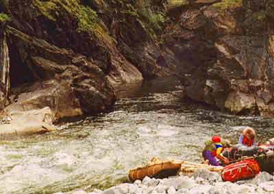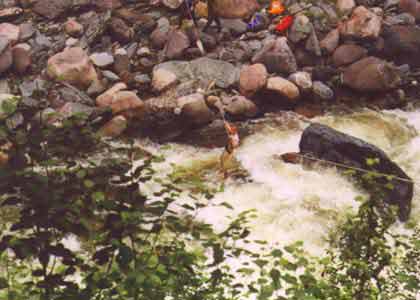 24 июля Дежурные Рома с Виталием. Всю ночь шел дождь, вода в реке прибыла на 30 см (а место не узкое). Цвет воды от зеленого перешел ближе к коричневому. Выходим часов около 11. Проходим оставшиеся пороги и шиверы до 19 порога. Перед ним встречаем группу из Кирова. Их стоянка расположена по левому берегу. Постепенно начинаем подходить к 19 порогу, перед ним чалимся, разведаем. Первую половину порога (до осыпи слева) решаем пройти как обычно, только пассажиры идут по берегу. Четверка проходит по основной струе ближе к правому берегу, я на двойке с Верой идем между камней недалеко от правого берега. Не доходя до осыпи метров 50 - чалимся. Стас с Ромкой идут на разведку, и мы остаемся ждать. Время близиться к обеду. Они проходили два часа, мы уже совсем собрались обедать. Спускаем катамараны дальше, за осыпь, на чалках. Затем проходим на четверке сильным экипажем еще метров 300. Двойку спускаем на чалке. Вода несет уже совсем бешенная, ближе к водопаду уклон увеличивается. С этого места (метров за 300 -400) начинаем обнос. Сначала несем рюкзаки. Вдоль по склону идет тропа. Мы пристали немного ниже маленького ручейка. Первые метров 200 тропа идет одна. Затем она разветвляется на две. Нижняя, по которой мы обносились, - нормальная тропа. По ней можно нести даже неразобраный катамаран четверку (правда тяжело). В одном месте там нужно штурмовать крутой каменный подъем, а, несколько дальше, есть достаточно крутой спуск. Длина тропы до того места, откуда мы собирались выходить, около 3 -3.5 км. Идти с грузом около 40 минут. Пройдя метров 100 по тропе, видна последняя горка перед водопадом. Слив с огромной бочкой смещен несколько вправо от центра реки. По моему мнению, в нашу воду этот слив категории 5..6, в нем могло бы спокойно кильнуть нашу четверку. Тропа обноса идет по заболоченной местности, и пригодных для стоянки мест долгое время нет. Тропа идет высоко, но можно спокойно приблизиться к краю обрыва и рассмотреть пороги в ущелье. Первый порог - водопад,