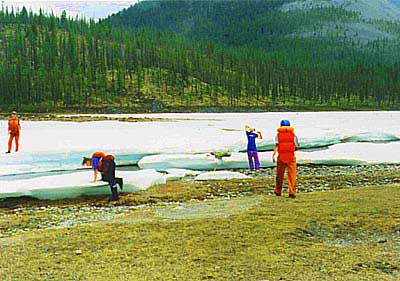 Река по ущелью вначале течет немного вправо, а затем резко, под 90 градусов поворачивает налево. В месте поворота впадает Шара-гол (справа). Общая длина ущелья примерно 3 - 4 км. Далее долина опять расширяется, и река мелеет, распадается на протоки. К вечеру доходим до притока Ара-Хонголдой. В его устье лежит большое ледяное поле толщиной около метра. Погода во второй половине дня испортилась - моросит дождь. Встаем на поляне возле этого притока. Справа и слева - протоки Китоя, стоим на острове.