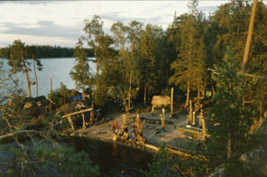 Дневка ознаменовалась поимкой трех или четырех здоровенных щук, всеобщей расслабухой, баней (баня была специально сшита заранее) с настоящей парилкой, питием спирта и залечиванием дыр. Дыра, собственно, была только одна - Таймень-3 посадил маленькую дырку точно на границе обклейки, из-за чего большая часть времени ушла на ее поиски. У первого Тайменя-2 открылись некоторые старые боевые раны. Мой Таймень ни разу не был ранее в опасных для шкуры местах, и потому старых дыр не имел. Зато заметно поободралась проклейка. Ее пришлось подремонтировать. Произошло и печальное событие - сын нашего руководителя, излазив весь остров вдоль и поперек, оступился и упал коленом на донышко разбитой бутылки. В результате на колене образовался разрез сантиметра три длиной и неизвестно какой глубины. Думали даже зашивать, но, опасаясь шока, крепко стянули края разреза пластырем, предварительно продезинфицировав рану. В результате до конца похода парень ходил на негнущейся ноге с костылем, как капитан Сильвер.