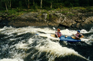 Интересное впечатление произвел последний перед Охтой порог - судя по лоциям - Курна. При подходе к нему кажется, что впереди только камни, дальше плыть некуда, река кончилась :-( . И только вблизи становится виден узкий бурлящий слив. Никаких сложностей этот порог не представлял, хотя камушки внизу были понатыканы со знанием дела. Пройти его чисто было особенно приятно, поскольку заранее было известно, что Охта-порог мы не пойдем, а потому Курна - последнее препятствие у нас на пути.