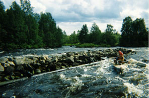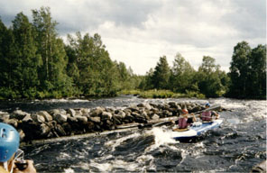 Итак, боевой день начался с прохождения плотины с озера Воронье. Еще в прошлый день мы сплавали к ней и осмотрели возможные проходы. Идти решили справа по сливу в бочку, поскольку левая струя, по которой тоже можно было-бы ломануться, казалась очень неустойчивой и непредсказуемой внизу. Плотину вся группа прошла без потерь, хотя лично наше прохождение оставляло желать много лучшего - мы ободрались о какое-то бревно, параллельное сливу. Правда, несильно. Неприятность ждала нас в шивере ниже плотины - один из камушков я попытался обойти слева, хотя нас явно несло направо. В результате мы не выгребли и классически легли на него правым бортом, прямо самой серединой лодки. На более сильном течении это была бы явная заявка на повязывание галстука. Вовремя дав откренку на препятствие и подставив струе днище, мы избавились от опасности, а затем относительно легко снялись, замочившись чуть выше колена. Уже в Кеми я обнаружил, что этот камушек стоил нам подпружиненного стрингера, который оказался выгнут внутрь, наподобие лука, и доставил мне немало хлопот при разборке.