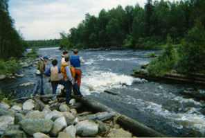 Чувствуя себя героями, вы выгрузились на крутом левом берегу, метрах в двухстах от первой ступени Кивиристи. Окрыленные победой над стихией, мы, позабыв о своих обязанностях дежурных, присоединились к толпе зевак, наблюдавших проход оставшихся членов нашей команды. Салют шел без груза, с изрядной дырой, заклеенной скотчем, но с девушкой в багажном отсеке :-( ) . Меньше всех повезло Тайменю-трешке, который шел последним. Его сразу прижало к отвесным камням справа, проскребло бортом через воронку за этими камнями, а потом, несмотря на все старания гребцов, утянуло в правый слив. Впрочем, никаких заметных повреждений лодка не получила.