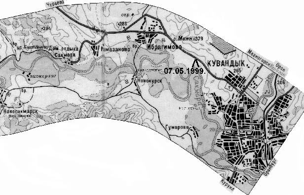 8 мая. Ночью опять была отрицательная температура. Встали на воду в 10:45. Подошли к Кувандыку. Прошли под низковисящим тросом паромной пешеходной переправы. Около разрушенного моста (отмечен на карте) произвели разведку. Проходили у правого берега. Через 45 минут после старта причалились чуть ниже устья реки Кураган, являющейся левым притоком Сакмары. Попытка подняться по Курагану вверх по течению для сокращения расстояния до железнодорожной станции оказалась безуспешной, поскольку река имеет большую скорость течения, чем скорость байдарки.