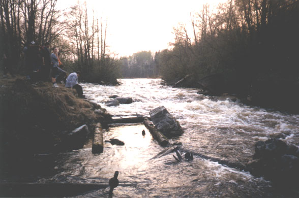 Самое узкое место - между опорами бывшего моста (или плотины)