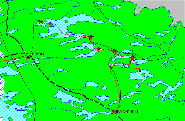 Маршрут проходит восточнее ж.д. Петербург-Мурманск. В