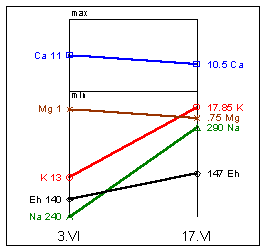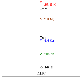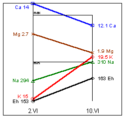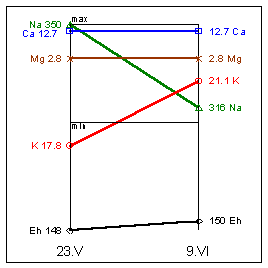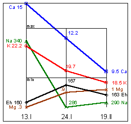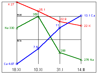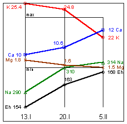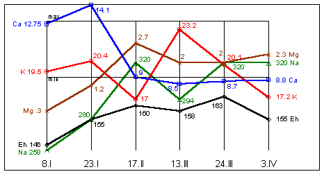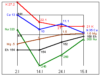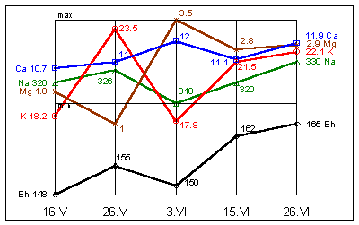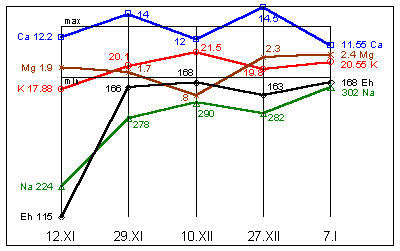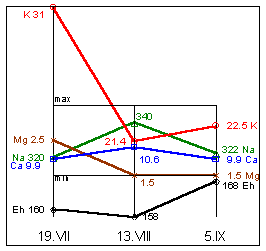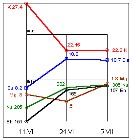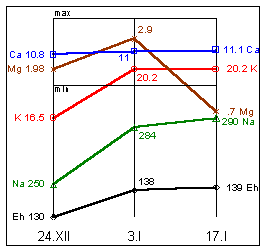 Na=310mg%; K=19,5mg%; Mg=1,9mg%; Ca=12,1mg%; Eh=163мВ.